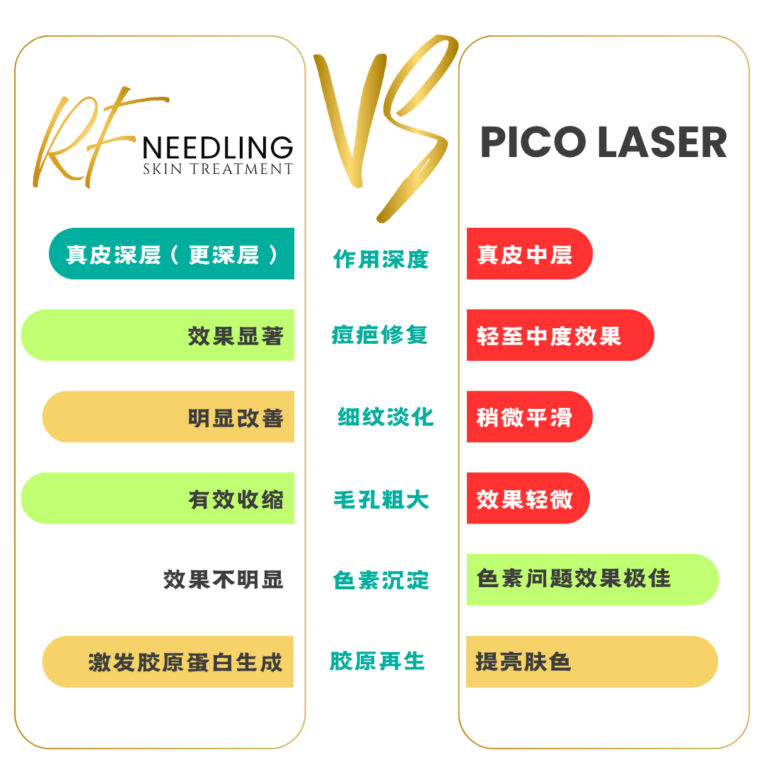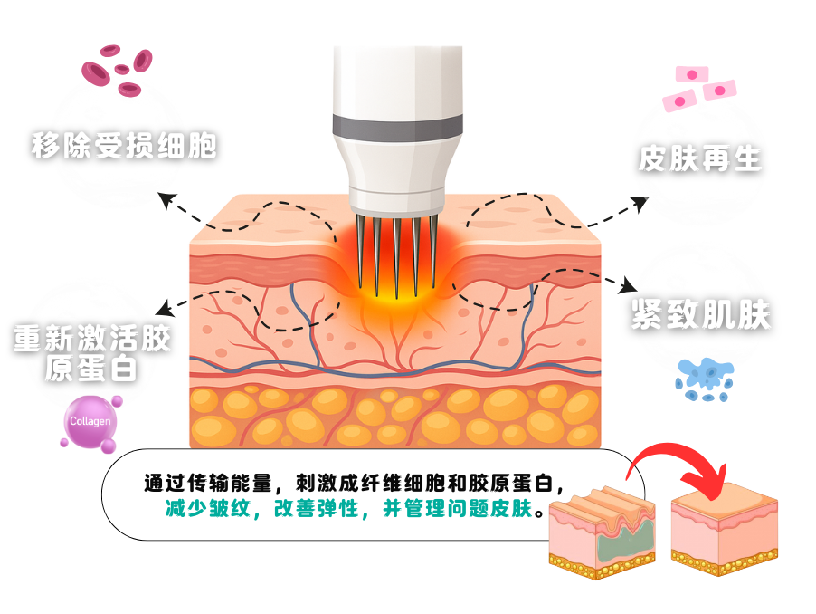 RF 微针射频直接深入修复,重塑皮肤结构,激活自身胶原再生。
